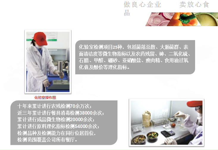 定期对餐厅的餐具、用具、食材等进行检测,如菌落总数、大肠菌群、瘦肉精、甲醛、二氧化硫、硼砂等。并且还配备了美国原装进口ATP荧光检测仪,可以移动、快速(15秒)对各餐厅的用具、盛器等随时进行表面清洁度检测,出具检测报告,随时监控,消毒合格,食品安全。